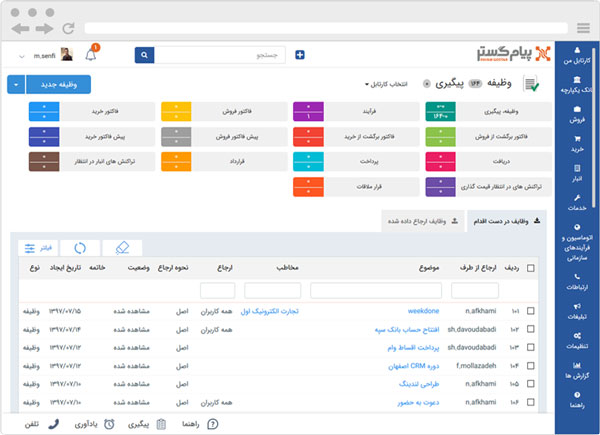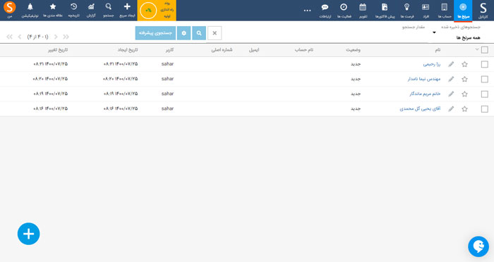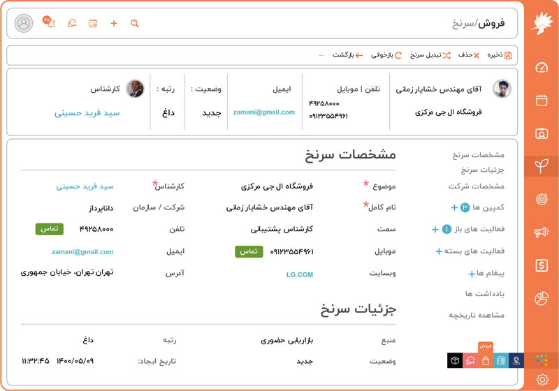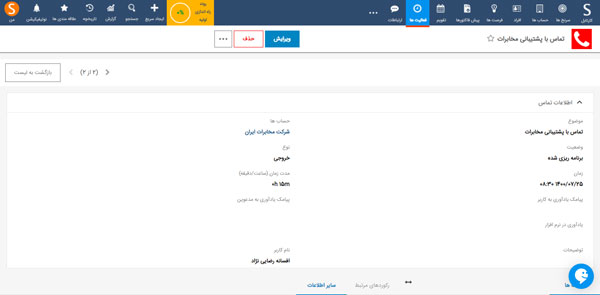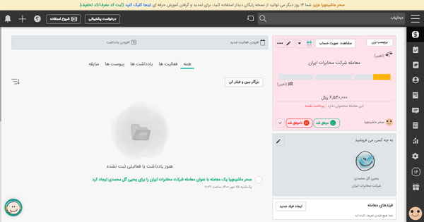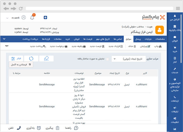 پیگیری تعاملات: ثبت و پیگیری همه جلسات، تماس ها، قرار ملاقات ها و پیام های مبادله شده بین اعضای تیم و مشتریان