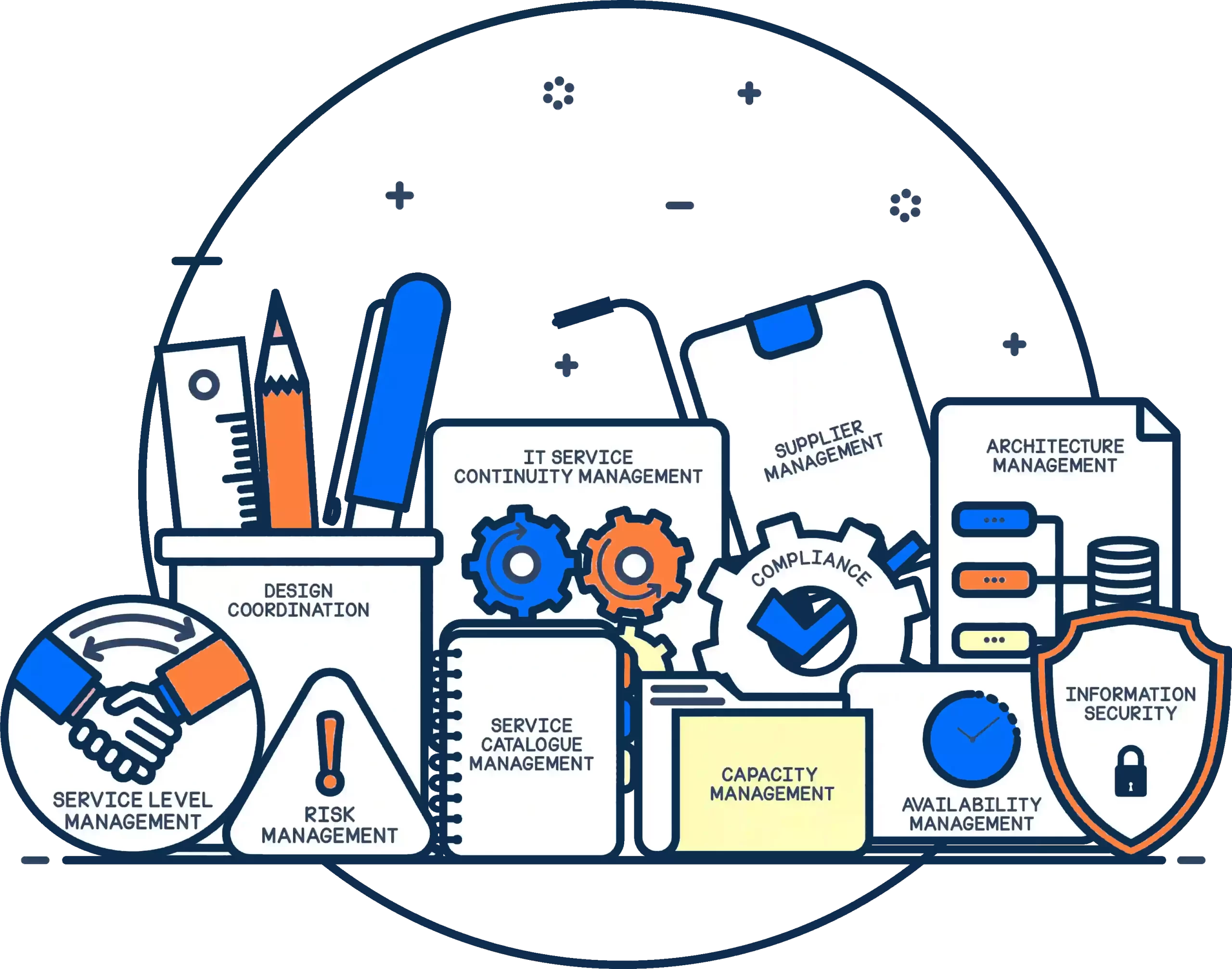 این مرحله به عنوان پایه یا چارچوب فرآیند ITSM در سازمان عمل میکنه. این شامل تعریف خدماتیه که سازمان ارائه میده، برنامهریزی استراتژیک فرآیندها، شناسایی و توسعه منابع و داراییهای ضروری برای حفظ جریان فرآیندها. استراتژی خدمات در هر سازمان شامل موارد زیر هستش: